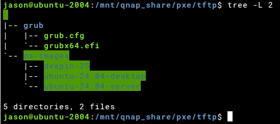 jason@ubuntu-2004:/mnt/qnap_share/pxe/tftp$ cat grub/grub.cfg set timeout=5 set debug=all menuentry "Boot from local disk" { exit } menuentry "Install Ubuntu 24.04 desktop(UEFI)" { set root=(tftp,192.168.50.218) linux /os-images/ubuntu-24.04-desktop/casper/vmlinuz root=/dev/nfs nfsroot=192.168.50.218:/pxe/tftp/os-images/ubuntu-24.04-desktop/ netboot=nfs ip=dhcp ignore_uuid loglevel=7 ro initrd /os-images/ubuntu-24.04-desktop/casper/initrd } menuentry "Install Ubuntu 24.04 server(UEFI)" { set root=(tftp,192.168.50.218) linux /os-images/ubuntu-24.04-server/casper/vmlinuz root=/dev/nfs nfsroot=192.168.50.218:/pxe/tftp/os-images/ubuntu-24.04-server/ netboot=nfs ip=dhcp ignore_uuid loglevel=7 ro initrd /os-images/ubuntu-24.04-server/casper/initrd } menuentry "Install Deepin 25(UEFI)" { set root=(tftp,192.168.50.218) linux /os-images/deepin-25/live/vmlinuz-6.6 boot=live union=overlay livecd-installer locales=zh_CN.UTF-8 nfsroot=192.168.50.218:/pxe/tftp/os-images/deepin-25/ netboot=nfs ip=dhcp ignore_uuid loglevel=7 ro console=tty splash nomodeset -- initrd /os-images/deepin-25/live/initrd-6.6 } menuentry "Try Deepin 25(UEFI)" { set root=(tftp,192.168.50.218) linux /os-images/deepin-25/live/vmlinuz.efi boot=live union=overlay locales=zh_CN.UTF-8 nfsroot=192.168.50.218:/pxe/tftp/os-images/deepin-25/ netboot=nfs ip=dhcp ignore_uuid loglevel=7 ro console=tty splash nomodeset -- initrd /os-images/deepin-25/live/initrd }