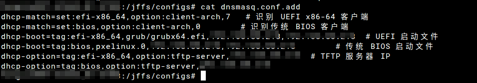 在/jffs/configs目录下增加dnsmasq.conf.add文件配置dhcp服务,指向tftp服务器地址,配置内容如下图所示(打码处为tftp服务器地址)